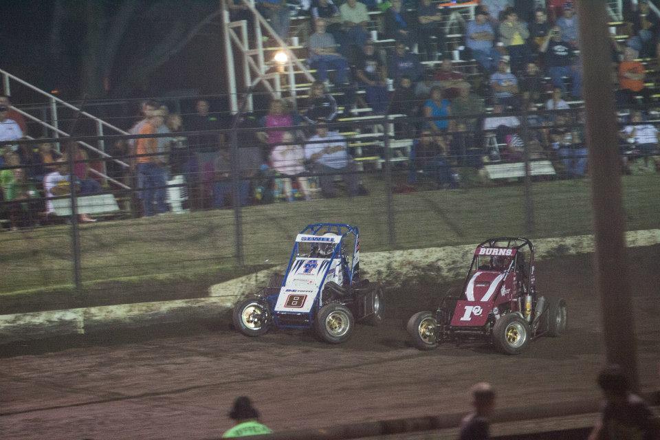 Broken Arrow, Oklahoma’s POWRi West point leader Alex Sewell raced from 7th to claim fourth at the line, a top five finish that might just seal the championship in his first full season in Midget racing (supposing he makes features both night in the two day finale at OKC). Sewell (#8) pictured racing against California's AJ Burns (#1ou) below.