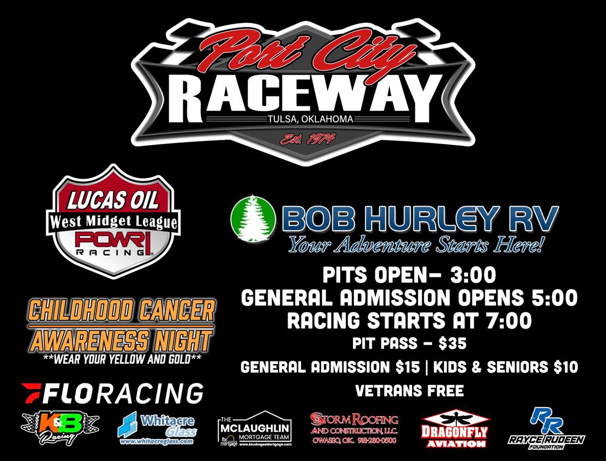 Hoss, Tulsa, OK. (September 10, 2022) –The wait is over as the Lucas Oil POWRi West Midget League is back in action at Port City Raceway tonight. As our Night Of Champions points battles heat up , the McLaughlin Mortgage Team Jr Sprints, Whitacre Glass Restrictors, K&B Racing A-Class, Dragon Fly Aviation Non-Wing and Storm Roofing & Construction Sportsman are all ready for a night of racing. We will also be having Collin’s Race to Beat Neuroblastoma Childhood Cancer Awareness Carnival. A night for childhood cancer awareness with games & prizes and we encourage everyone to wear yellow/gold to show your support. Raffle items, prizes and more with all proceeds raised will go directly to research or families in need of support. If you have any further questions please feel free to call 918-899-9605. Remember if you can’t make it to the races you can watch live on FloRacing.