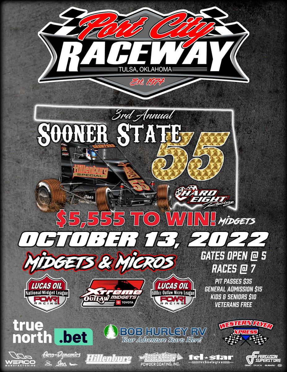 Hoss, Tulsa, OK. (October 11 , 2022) – Another highly anticipated midget race is on the horizon at Port City Raceway. The Sooner State 55 featuring the Lucas Oil National and West Midget Leagues and the Xtreme Outlaw Midgets presented by Toyota take on the 1/8th mile this Thursday October 13. Racing for a 5,555 payday and bragging rights we also welcome to the racing program the POWRi Outlaw micros racing for a $1,555.00 payday. The Donnie Ray Crawford Legacy Foundation will be in attendance with merchandise on sale. Port City Raceway Officials along with the DRC Legacy Foundation would like to thanks the out pouring of support for this event. Without sponsors like Hard 8 Racing, Bob Hurley RV, TrueNorth.bet and Western Flyer Xpress this event wouldn't be possible. We look forward to seeing you on Thursday October 13th. If you have any further questions please feel free to text or call 918-899-9605.