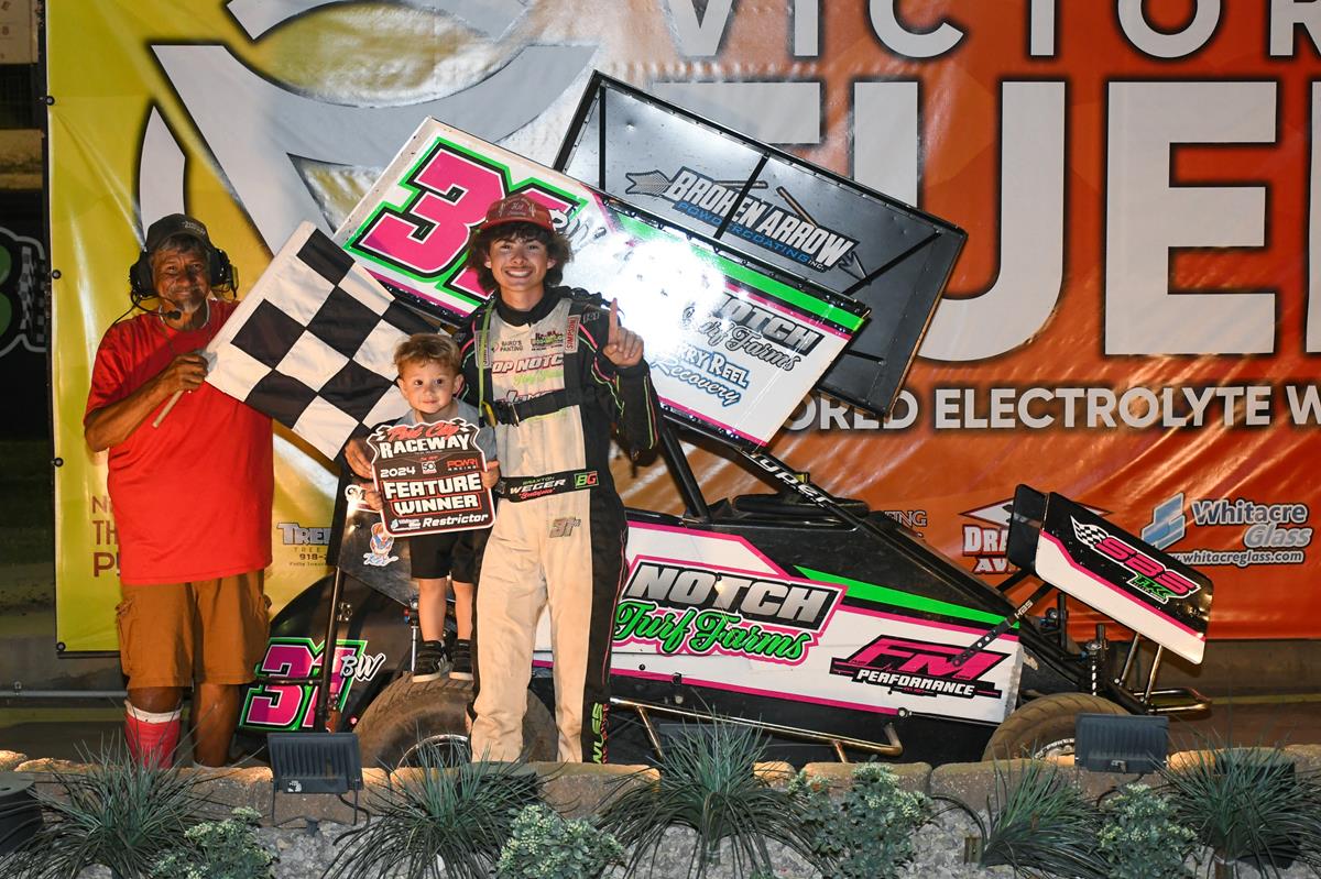 Restrictor: Whitacre Glass A Feature (20 Laps): 1. 31BW-Braxton Weger[1]; 2. 11AZ-Annalesia Miller[2]; 3. 27-Brody Stewart[6]; 4. 1-Hudsyn Truitt[4]; 5. 20T-Tyler Crow[9]; 6. 87C-Callan Hill[11]; 7. 175-Masyn Truitt[17]; 8. 95-Ryker Morrow[14]; 9. 36-JJ Beason[5]; 10. 14Q-Camden Kroening[7]; 11. 57-Kaden Gramm[16]; 12. 66-Remi White[10]; 13. 0-Hunter Adams[8]; 14. 12F-Oakley Fuller[3]; 15. 9S-Braxton Stewart[13]; 16. 4AZ-JB Morris[15]; 17. 2K-Kinsley Coughran[12].