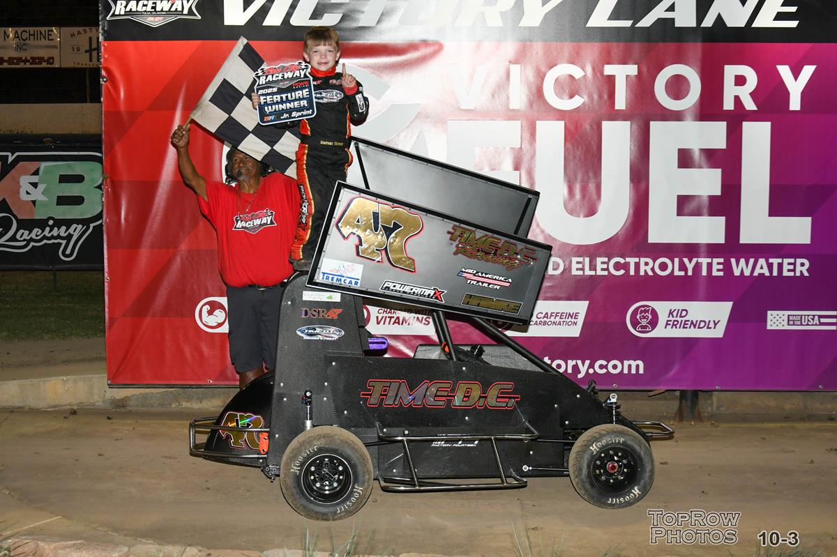 Whitacre Glass Heat 1 (8 Laps): 1. 00-TJ Stark[2]; 2. 73-Chase McDougal[5]; 3. 45-Steven Hefley[1]; 4. 66W-Hunter White[4]; 5. 42-Luke Anderson[7]; 6. 5C-Cooper Miller[6]; 7. 97-Mavrick Page[3]; 8. (DNS) 91-Jason McDougal